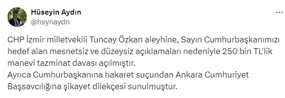 Başkan Recep Tayyip Erdoğan’ın avukatı Hüseyin Aydın, yaptığı açıklamada, “CHP İzmir milletvekili Tuncay Özkan aleyhine, Sayın Cumhurbaşkanımızı hedef alan mesnetsiz ve düzeysiz açıklamaları nedeniyle 250 bin TL’lik manevi tazminat davası açılmıştır.